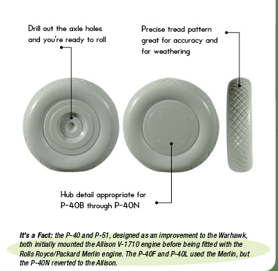 The Hasegawa 1:32 Warhawks are nice, but can they be improved? Oh, yeah. Our wheels have a nicely-done tread pattern to them that is far better for the often-rough fields the P-40 operated from than the smooth tread included in the kit.