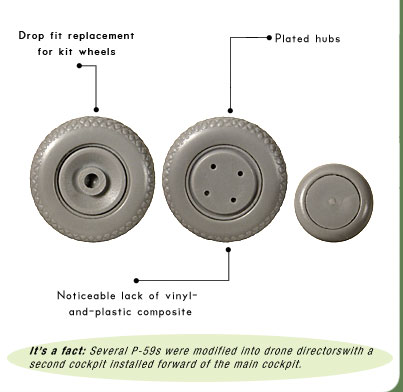 Fits Hobbycraft kits Not wanting to leave out the folks building the early P-59s, we brought out this companion to the P-59 spoked-hub wheels. These are just like them… except they have plated hubs. This is early jet science, not rocket science!