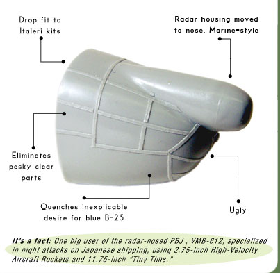 Fits Italeri kits Another absurdly easy conversion. Leave out the clear nose from Italeri's PBJ, put our nose on and you instantly have a South Pacific veteran. The nose mount for the radar was a common field modification.