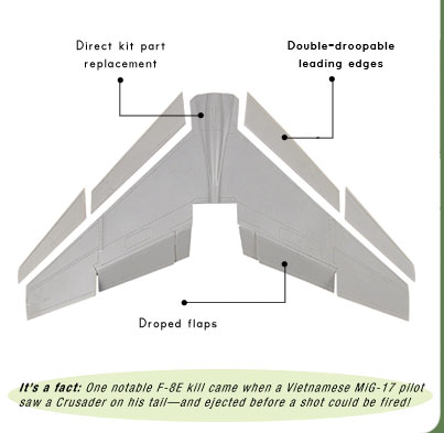 The new Academy kit allows you to build the wing in the raised position, but there’s one problem: when the wing went up, the flaps and droopable leading edges went down. This set gives you a wing with dropped flaps and separate leading-edge droops that allow you to give your F-8E that aggressive, letting-it-all-hang-out look.