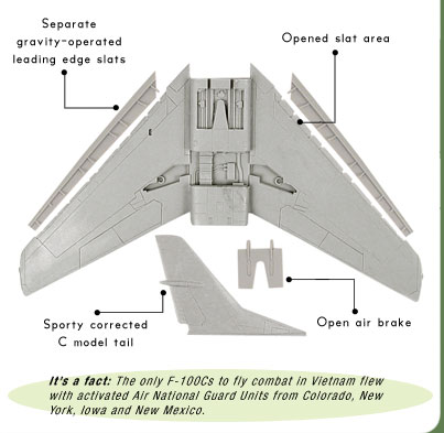 The first major production variant of the Super Sabre saw considerable action in Vietnam and was a staple in Air National Guard units, but just try to build one! With a different wing planform and different bumps on the vertical fin, it’s been difficult until now. This set includes the -C wing with dropped slats and a new vertical tail. You’ll be ready to fly close-air support against the cat in no time!