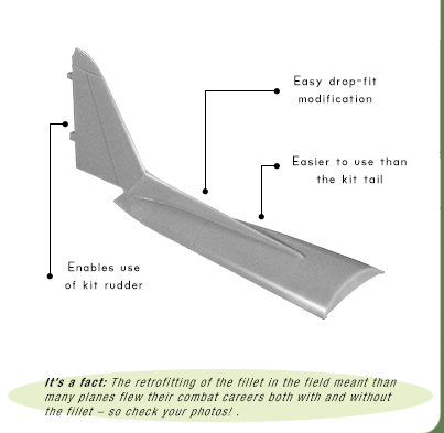 Starting with the P-47D-28 and the P-47M, a fillet was added to the tail of the Thunderbolt to improve lateral stability. The fix was so successful that Republic began making kits for retrofitting earlier P-47D models in the field. Our filleted tail is a drop-fit to the Tamiya kit – replace the kit tail with this, and you’re done!