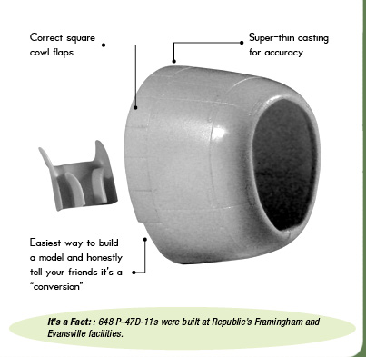A new cowling with the correct squared-off lower flaps and a brand-new chin intake are all it takes to backdate your Tamiya Razorback into an early P-47D-11 (and, if you are gutsy, could give you a head start on even earlier P-47s). A drop fit for the kit – just swap these for the kits parts!